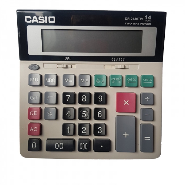 ماشین حساب کاسیو مدل DR-2130TW یک مدل ماشین حساب رومیزی با دکمه های نرم و روان است که صفحه نمایش بزرگ و شیب دار آن قابلیت نمایش 14 عدد را داشته و برای مصارف حسابداری و فروشگاه ها بسیار مناسب است. از ویژگی های ممتاز این ماشین حساب می توان به تامین برق مصرفی از 2 طریق باتری و پنل خورشیدی اشاره کرد که در روز یا محیط های پرنور بدون نیاز به باتری می توانید از آن استفاده کنید. علاوه بر آن این ماشین حساب به چراغ LED تشخیص اسکناس نیز مجهز شده است.